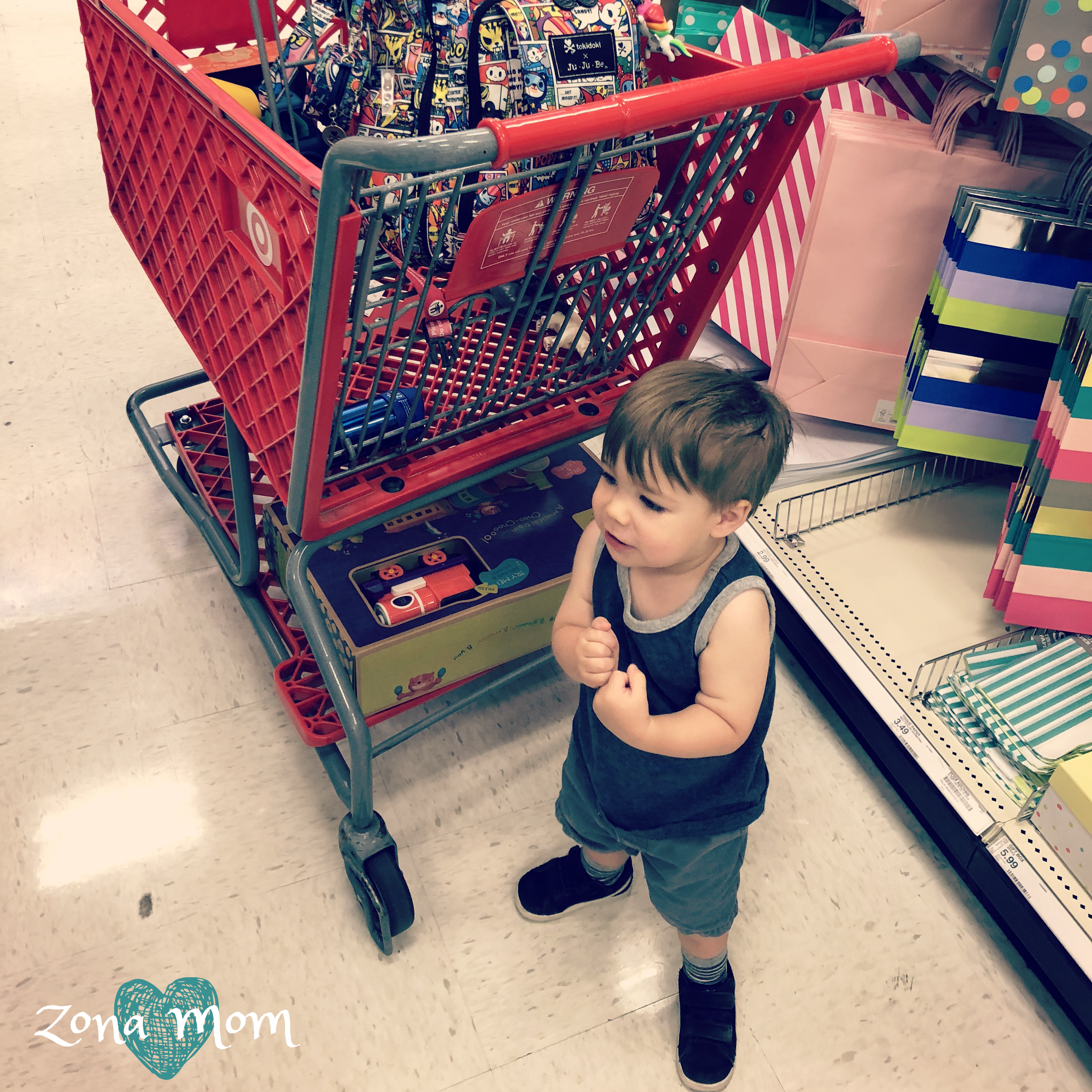 I have officially entered “Birthday Season”. It seems that I have a different birthday party every weekend. So we headed off to Target, to get some birthday shopping done. With a toddler it can be pretty difficult to toy shop for others without a tantrum or two. Fortunately, Jasper had his own money today and was able to not only shop for a friend but also for himself. Jasper fell in love with a train set from B. Toys (Battat) and wasn’t leaving the store without it.