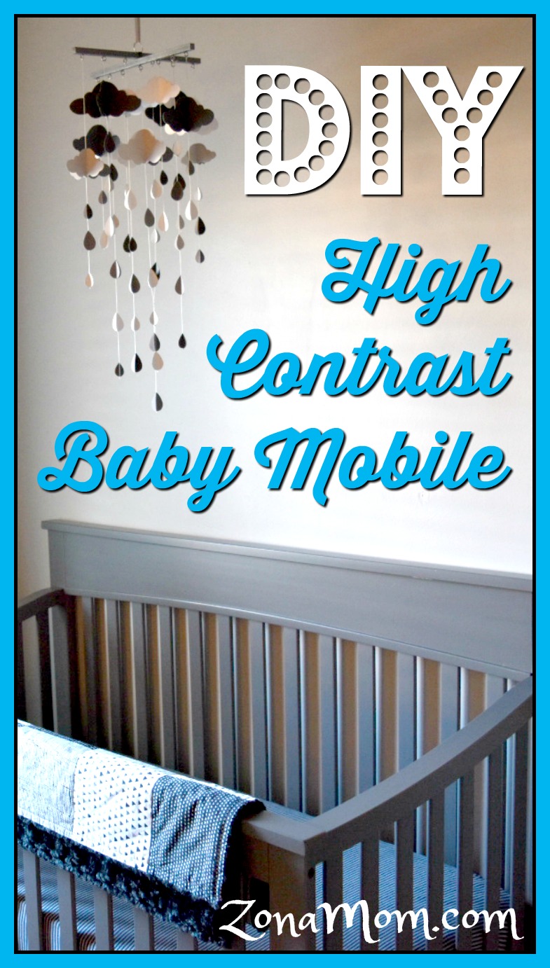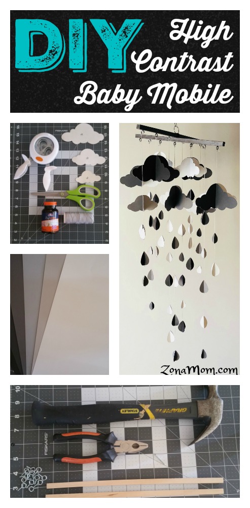 Hello again readers! This past weekend I had been looking through my photo library and came across some images of a DIY high contrast baby mobile project I did while I was pregnant with my now almost 15 month old. During my serious nesting phase of pregnancy is when we really started to put together my son’s nursery. We were on a budget of course (babies are pretty expensive) and we wanted to do as much as possible of the nursery decor ourselves. Without any specific theme in mind we decided to just go with things that we liked and our four favorite colors. The colors we chose to decorate around were a plum-ish purple, teal, grey and black. When it came time to chose a mobile for over the crib I had no idea what I wanted or what to look for. I read about how high contrast mobiles help with brain development in infants, I knew that is what I wanted.
