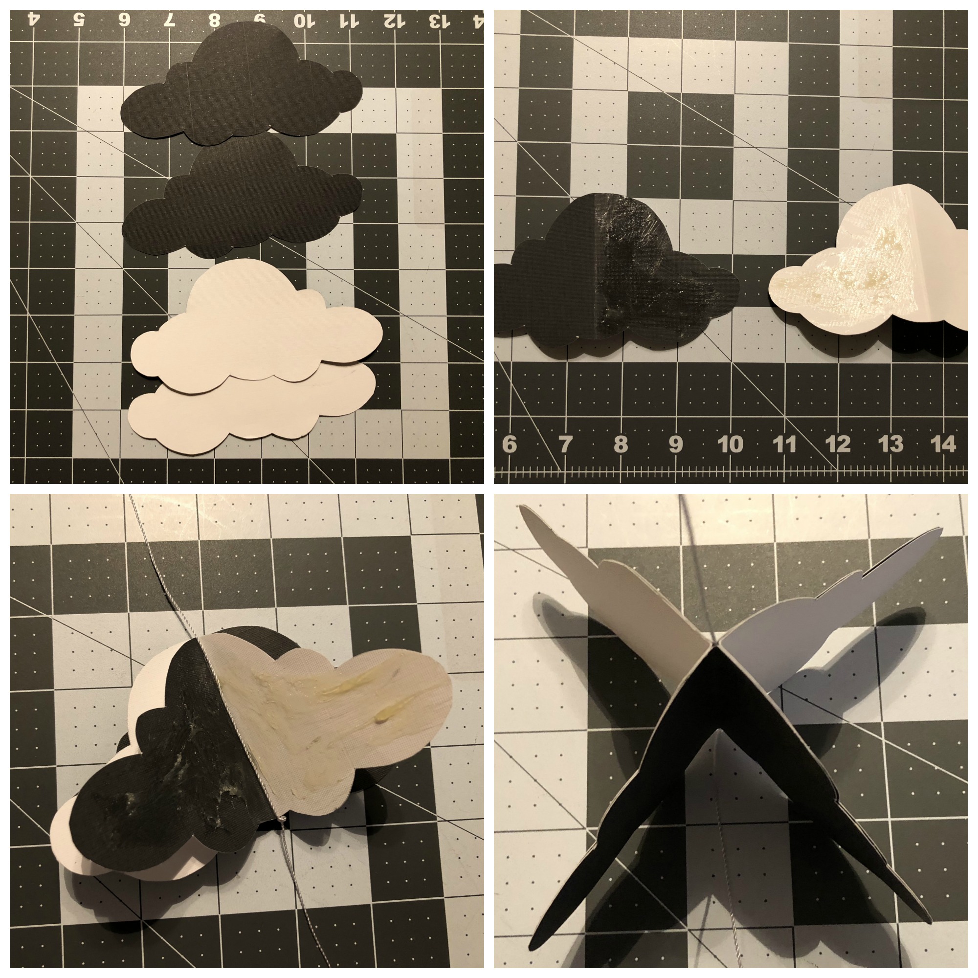 - Using the cloud templates that you made, trace and cut out four different colors of each cloud size making sure to keep the marked upside the same on all of your four cut-outs. I made eight varying-in-size/four-sided clouds for my mobile. To make the clouds, fold each cloud in half, match up the clouds and lightly rubber cement each side then stick together and hold until dry (see pic/collage for better understanding).