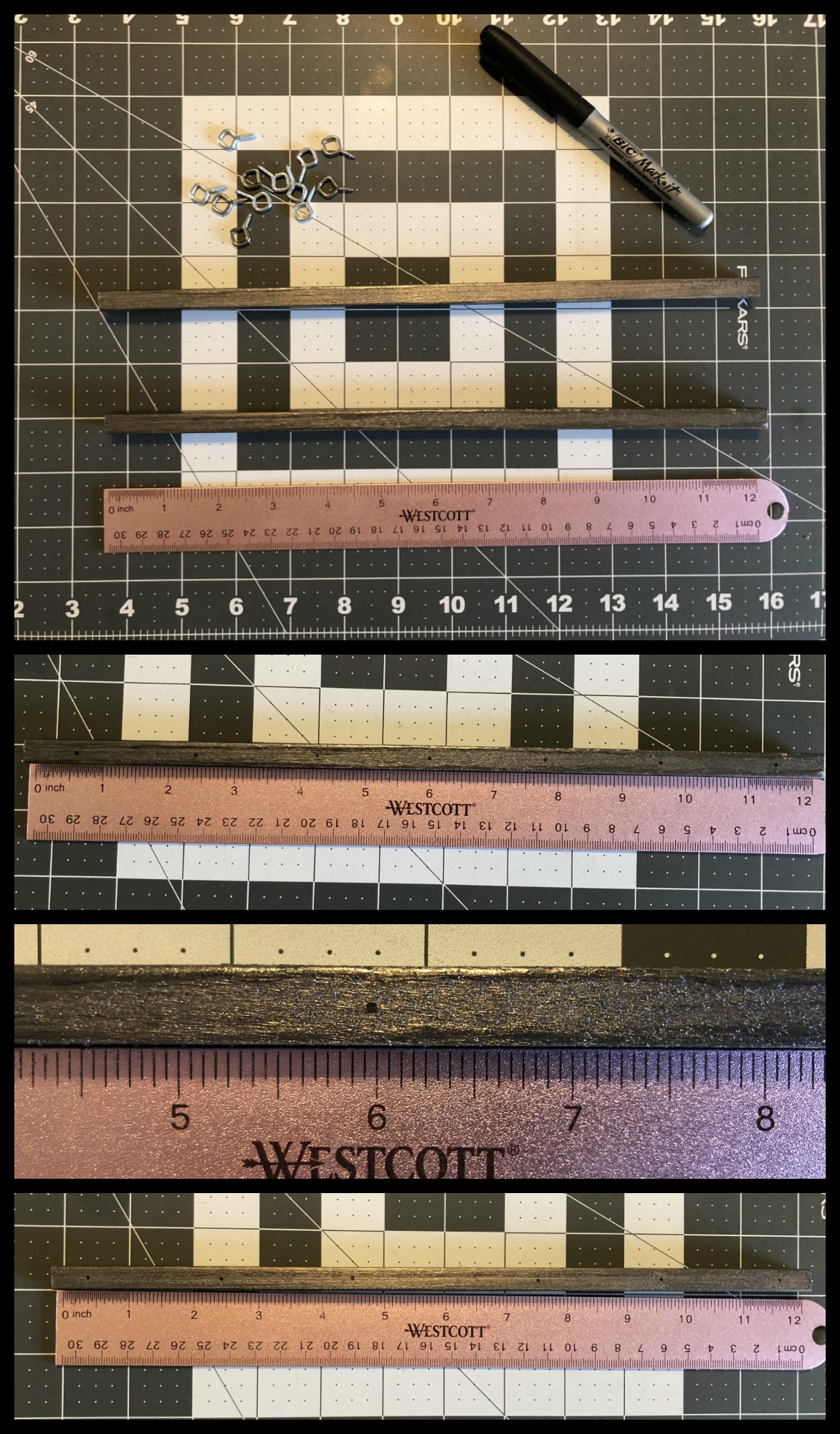 - On your two dowels make dots marking where you are going to place your eye screws for the strings of the mobile. On one dowel I marked the center (6″) then marked 1 3/4″ from that mark then another 1 3/4″ from the second mark and then again 1 3/4″ from the third mark. This will give you seven marks if you do this on both sides of the center mark. Then on your second dowel find the center (6″) and place a mark there. Turn that same second dowel upside down and mark on the opposite side your marks for the eye-screws. On this dowel I marked measuring from each end at 1/2″ then 2 1/2″, then 4 1/2 “… this gives you six marks on one side and one mark at 6” on the other side.