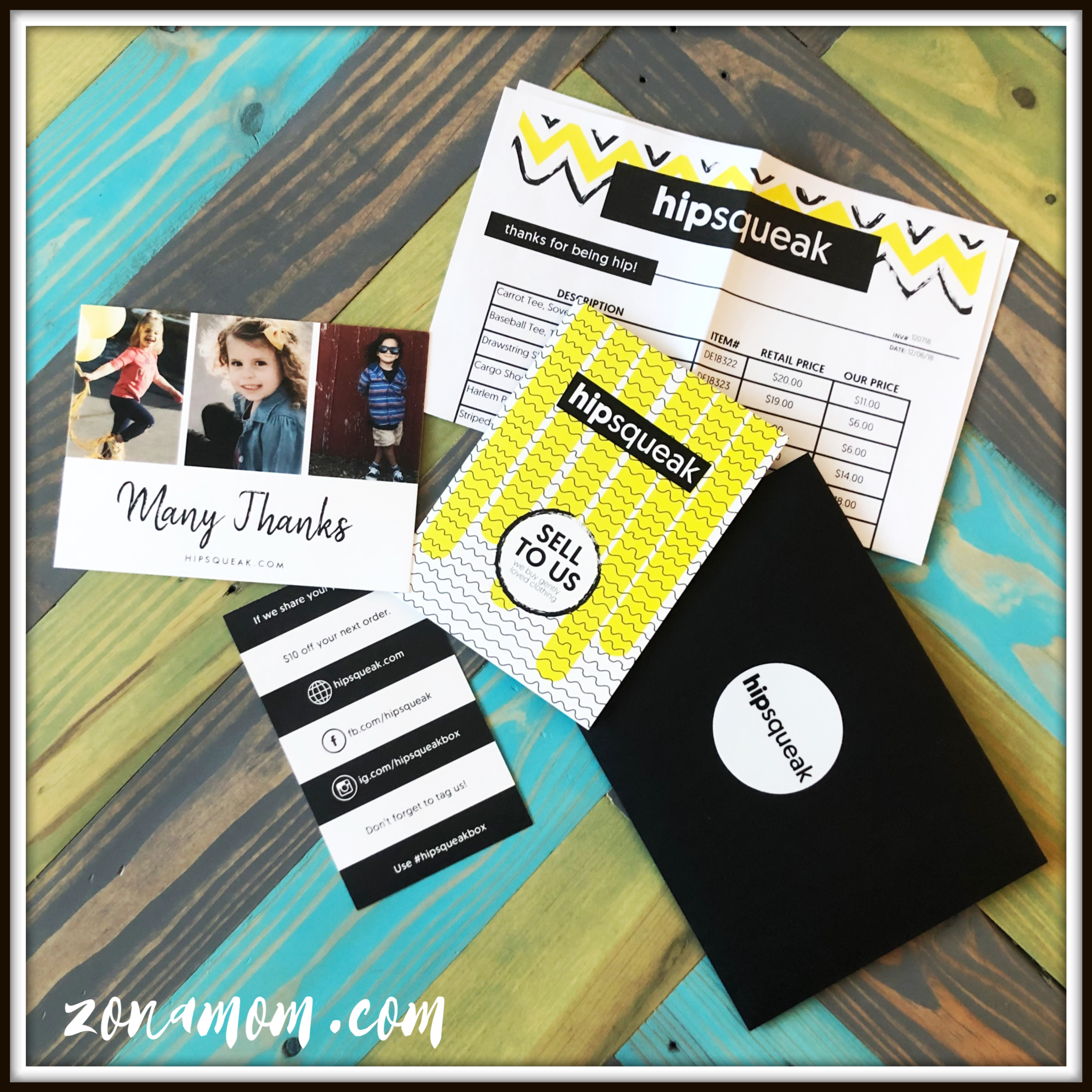 Included in the box was a return shipping label. If you were sending back any of the items picked out for you, Hipsqueak made it very easy. You simply stick the return label on the taped up box (remove any old labels first) then drop it off at a UPS drop off location. Also found in the box was an envelope that contained a thank you card, price sheet, social media information card, and information card on how to sell to Hipsqueak.