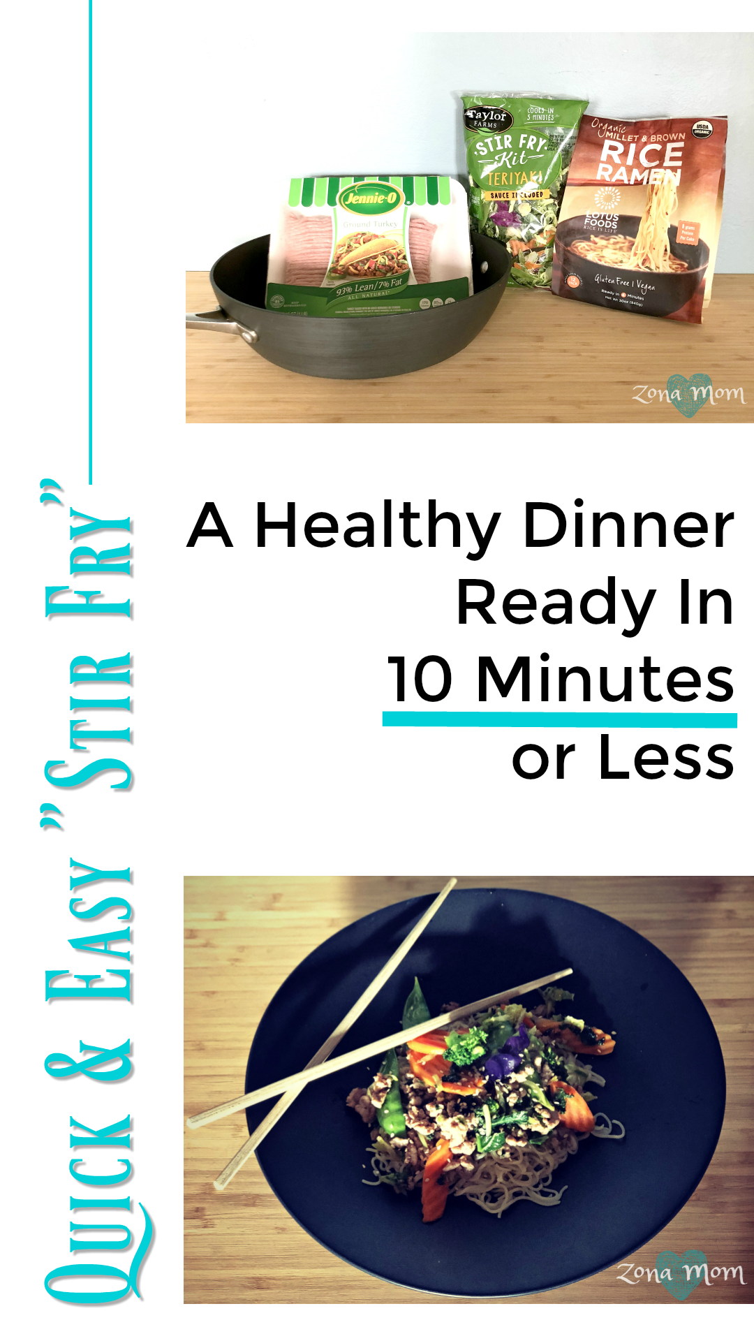 One of my biggest challenges since the birth of my son has been cooking. I really enjoy cooking, however, my now toddler rarely gives me much time to do so. Having a few time saving and super easy meals in my arsenal are a must. This quick and easy dinner has zero prep time, and minimal dish dirtying, which also saves time after. Best of all this stir-fry is under 500 calories making a great alternative to fast food.